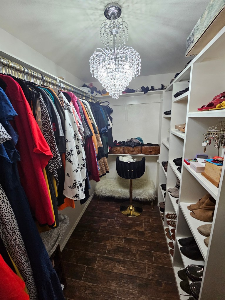 When the baskets came in, I filled them and placed them on top of the dresser. My formal gowns went each inside a dress bag, put onto a uniform hanger, and hung, and every single article of hanging clothes I removed from the old hanger, put inside a uniform hanger and hung in order of season and size.