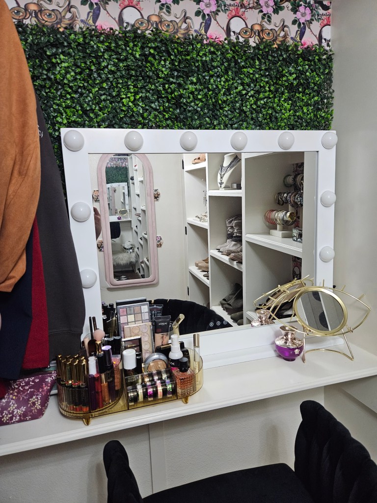 Now mind you, I don’t do much makeup. I just don’t know how, so for me it wasn’t going to take much organization to fit what I owned. I chose one small organizer for my makeup, a vanity mirror that was the exact right width and had multiple light brightness and warmth options, and some grass wall panels to add a pop of green and cover the height of the closet wall that I wasn’t going to be able to cover any other way.
