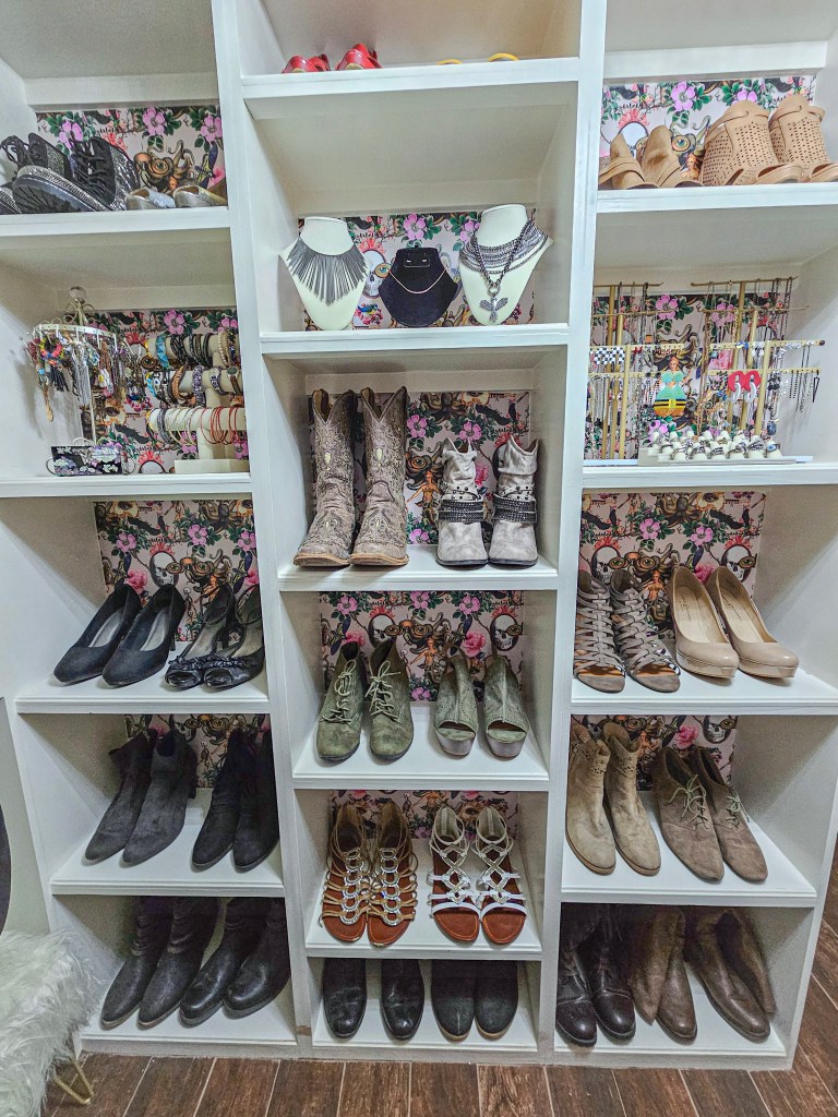 Once the wallpaper was up I put my shoes (2 pairs each) in cubbies. To make this as beautiful as possible, I tried to put similar shoes together, so neutral heels next to other neutral heels, boots next to boots, black heels next to black heels, etc.- you get the picture. The shoes that were more worn, flats, and tennis shoes I setup on the very top shelf of the closet, slanted so I could see them well enough to choose them when needed.