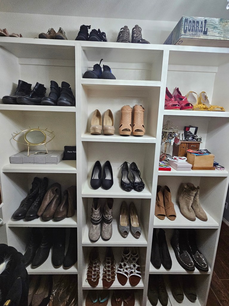 The first step I took in this closet re-organization and makeover was to take inventory of the “categories” I was looking to organize, and quantity of each article.