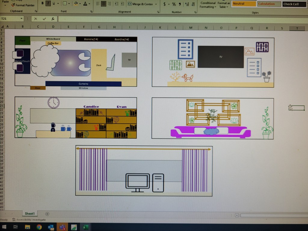 I made a rough outline of the room in excel and making mockups of a birds-eye view, as well as a mockup of each wall. This was the ultimate goal of what the space would look like- though I ended up scaling back some of these to keep expenses down.