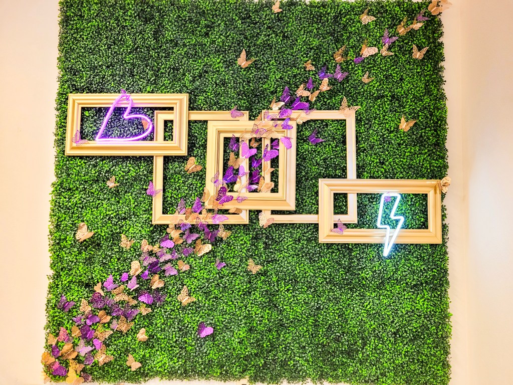 I hung the frames using wire and thumbtacks, hiding all but the frames within the grass. I then hung the neon heart and lightening using command hook velcro and hid the battery boxes belonging to them within the grass as well.