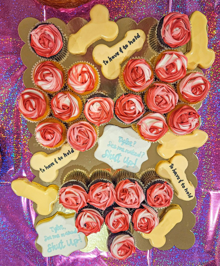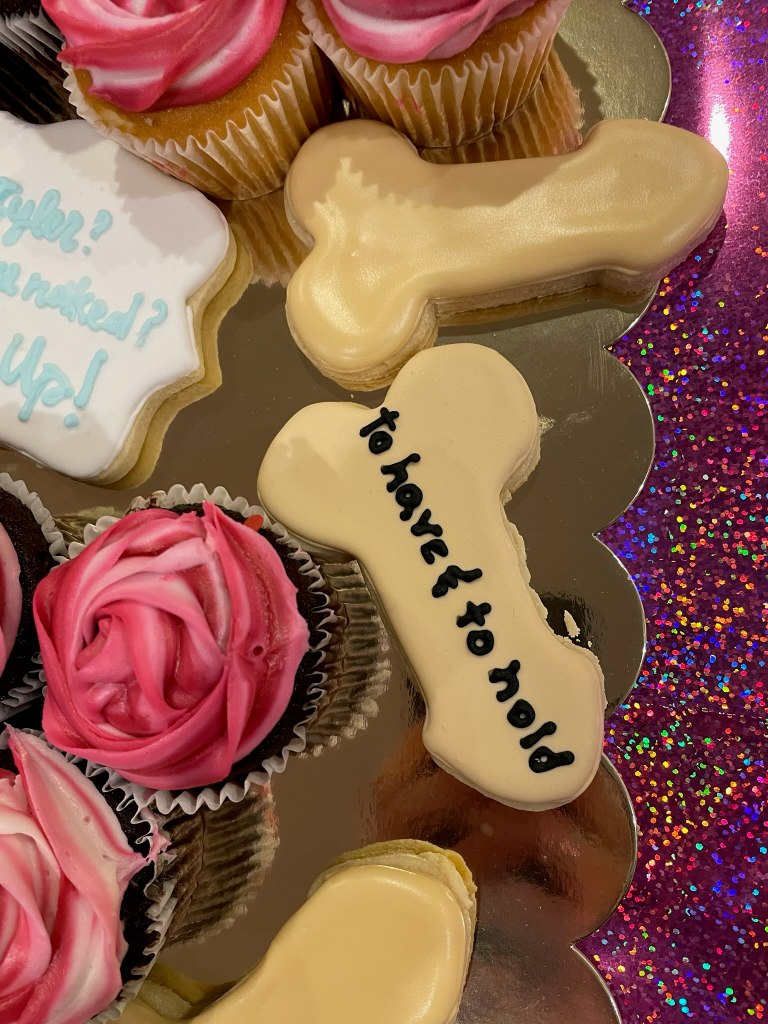 For dessert I arranged cupcakes in the shape of lingerie and surrounded it with cookies from my best friend and amazing cookie artist CaseyJo_Cookies.