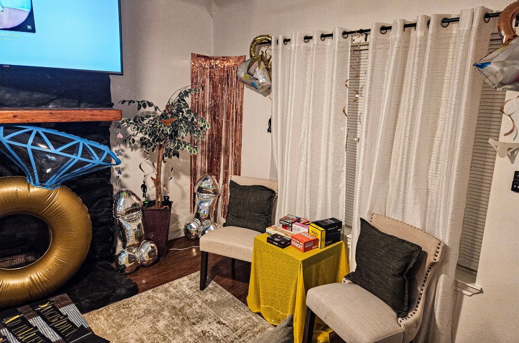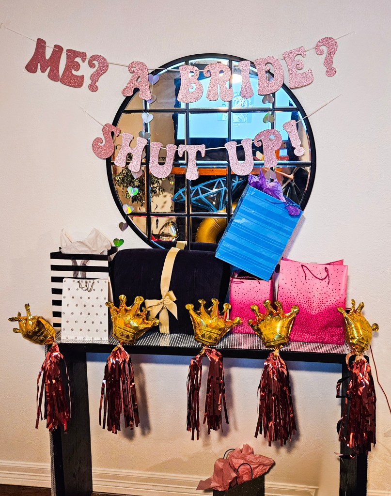 There was a small console table at the entrance of the house, so I put a “disco” runner on it, some tassel and crown balloons on it to stage it for holding all the gifts.