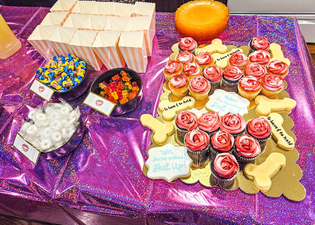 The final piece to the decor puzzle is the table with snacks, drinks, and dessert. We did also serve dinner (wings and street tacos), but we did that a little less dressy and just placed it all on the empty counters.