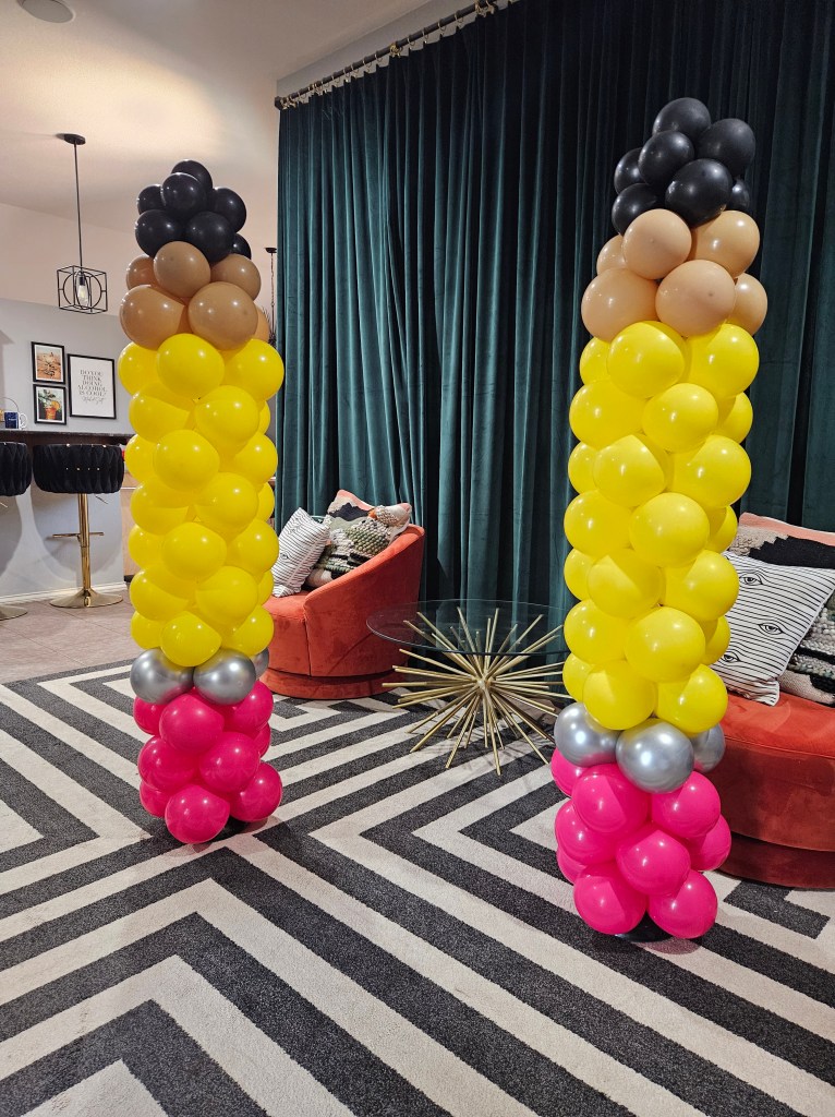 For these balloon columns I used lamp stands, PartyWoo balloons and a balloon sizing box. As pictured, I made 3 layers of pink balloons, 1 of silver, 7 of yellow, 2 of tan, and and 3 of black.