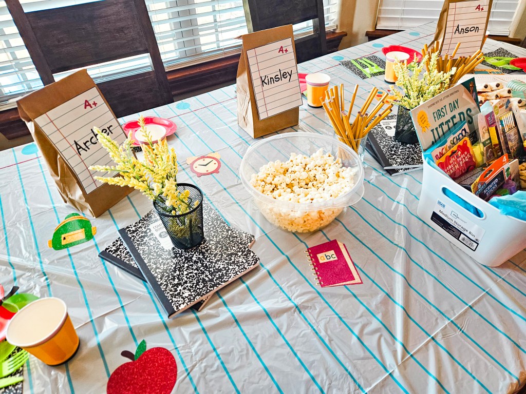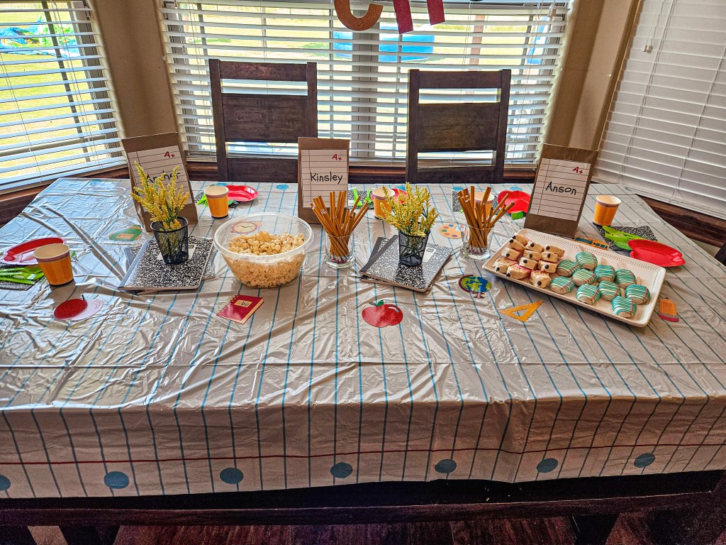 For the table itself, I ordered a kit that included a notebook paper-style plastic tablecloth, apple shaped plates, pencil style cups, and composition notebook printed napkins. I also used the fruit and school supply cutouts that came with the “Back to School Banner” as additional pieces of decor on the table instead of stringing them for hanging decor.
