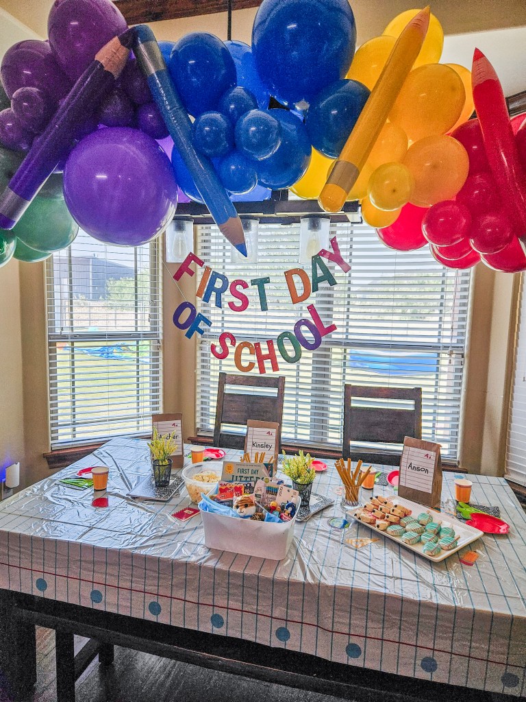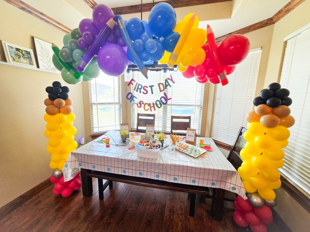 The final touch of the floating decor was a multi-color “First Day of School” banner. I used fishing line instead of the ribbon that comes with the banner to string it up so it appeared to float more invisibly and gave more length to tie up to the chandelier under the arch and cut the excess fishing line.