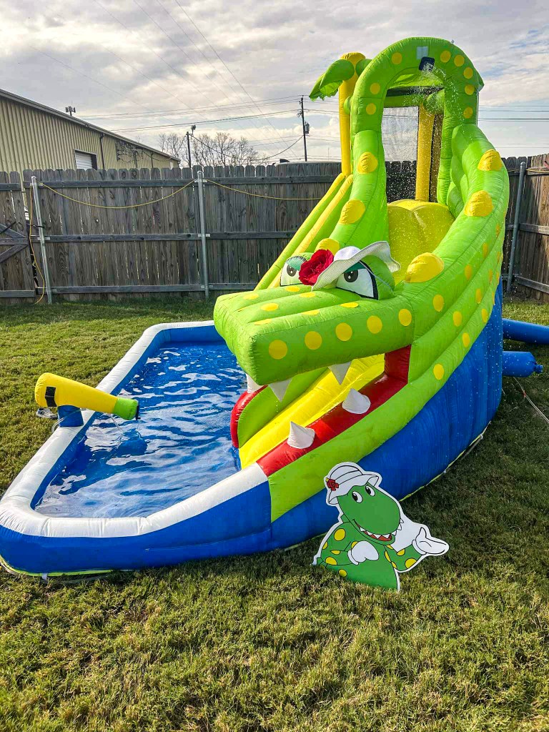 I setup my alligator slide, and added yellow vinyl circle stickers all over the alligator‘s body. I finished it off with a floppy white hat and large red flower to turn the alligator into Dorothy the Dinosaur. I used the same set of Etsy printable characters to print a large Dorothy cutout and used poster stakes to secure the character to the lawn. This established this slide as our Dorothy the Dinosaur slide!