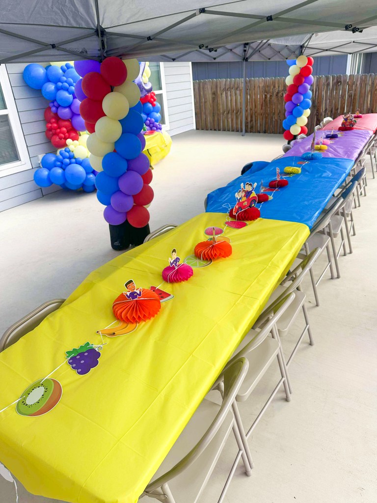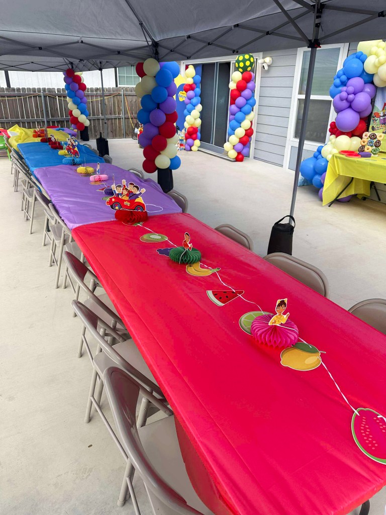 Under the canopies I placed 4 rented tables side by side and placed a Wiggles’ colored plastic tablecloth on each.