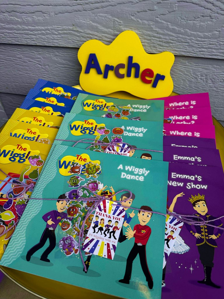 The party favors were Wiggles books! Because so many of our guests were siblings, I purchased two packs of a Wiggles book set so that the siblings could each take home a different book.