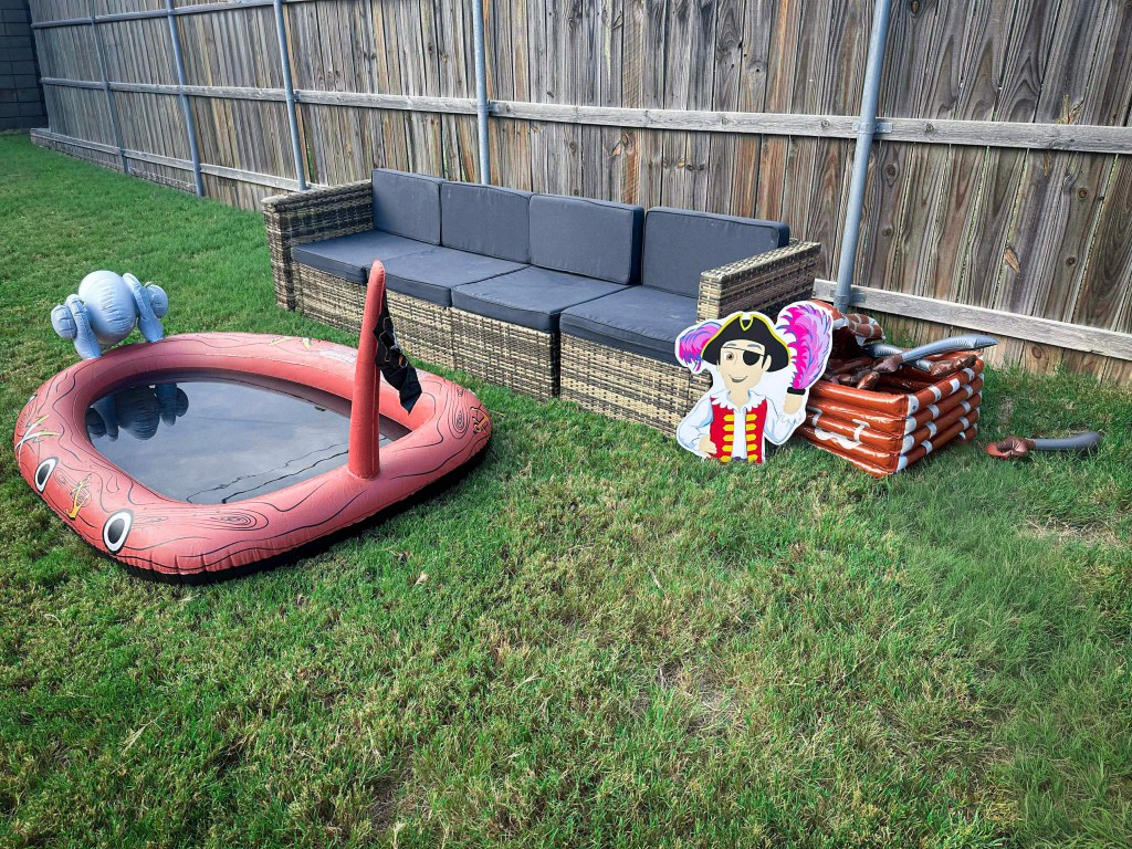 For the babies I used an inflatable pirate pool that is perfectly shallow for crawlers. I borrowed my lawn furniture to give the parents a place to sit with their little ones, and added an inflatable treasure chest full of inflatable swords off to the side. I printed a large print of Captain Feathersword and placed in the lawn with poster stakes to designate this area as the Captain Feathersword area.