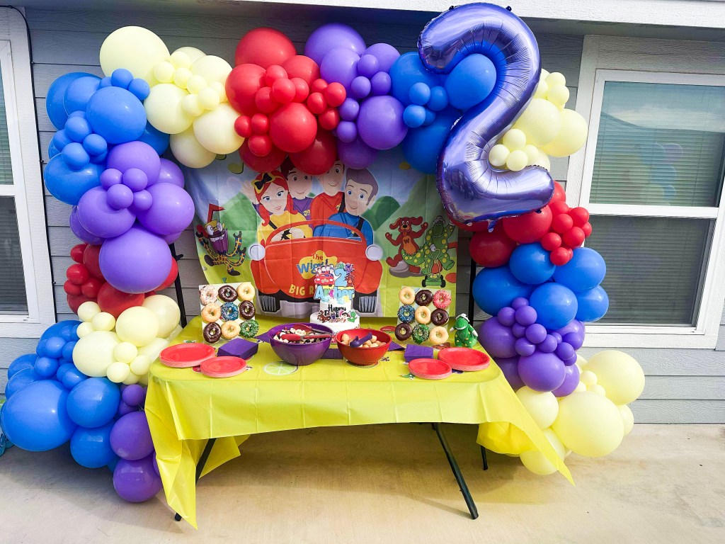 The last area of the party was the food area. I used a backdrop stand and purchased a Wiggles backdrop. To fill in the space I made a balloon arch across the whole frame in the four Wiggles’ colors and added a giant foil “2” for my son’s age.
