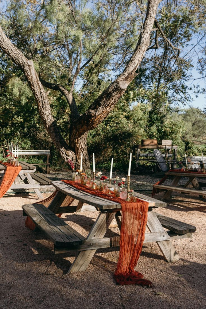 This concept is simple and easy to execute. It can be accomplished with any color scheme or theme and highlights the most important elements of the event: nature marries color. By keeping the wood of the table visible, you not only create continuity with the surrounding nature, but you also avoid issues like a foot getting caught on a tablecloth and disrupting the decor while trying to “swing your legs under the picnic table”, as one has to do with this type of table.