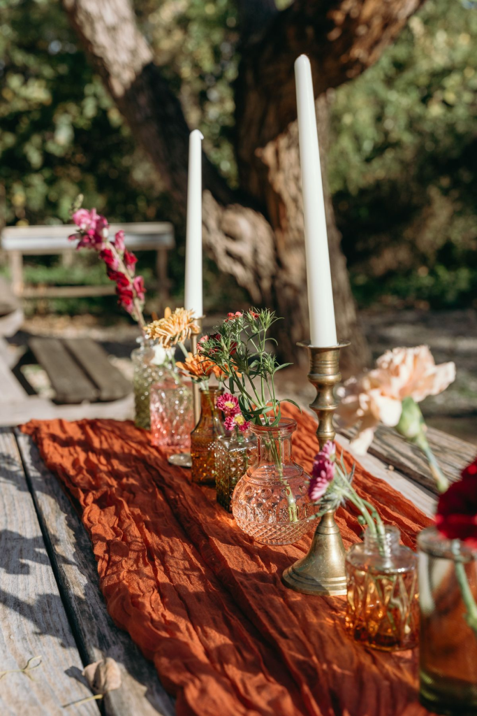 For the most color I added a terracotta cheesecloth runner. I selected the longest runner I could find (these ate 10ft) so that it would drape elegantly on the ground below. The texture and sheerness of the runner made it look comfortable, like it belonged, in the backdrop of trees and nature.