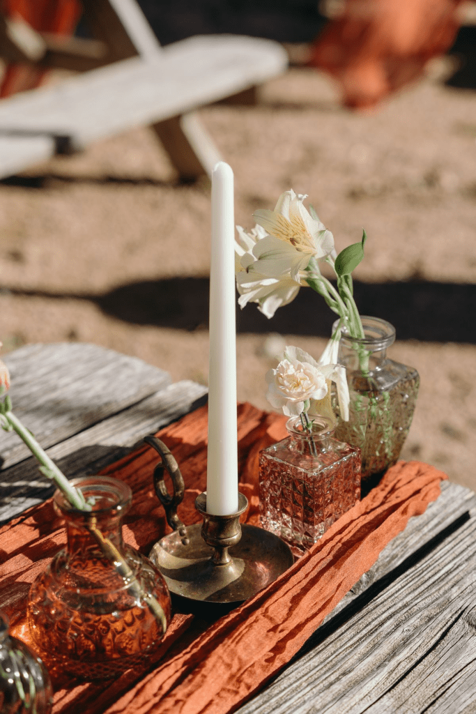 Brass candlesticks and candles brought in another texture and some height along the length of the runner. Various shapes and colors of glass bud vases brought more visual interest to the area and helped tie in all the remaining colors featured in the wedding.