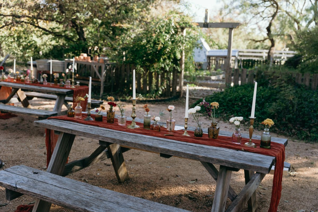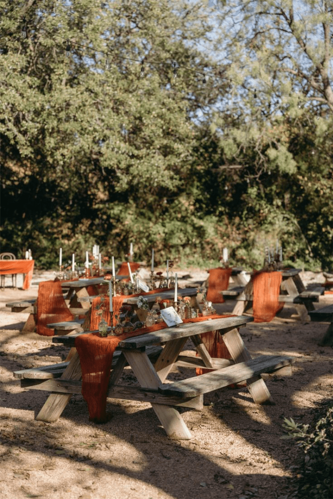 When I realized that our seating would be entirely these picnic tables, I started searching for inspiration and picnic table decorating ideas online, but came up empty. I started trying to visualize how different decor might look. Though tablecloths might look fine (I didn’t attempt this) I ultimately decided that keeping some of the natural wood of the table visible while still adding color and theme would be the best option to keep a natural feel in the outdoor event.
