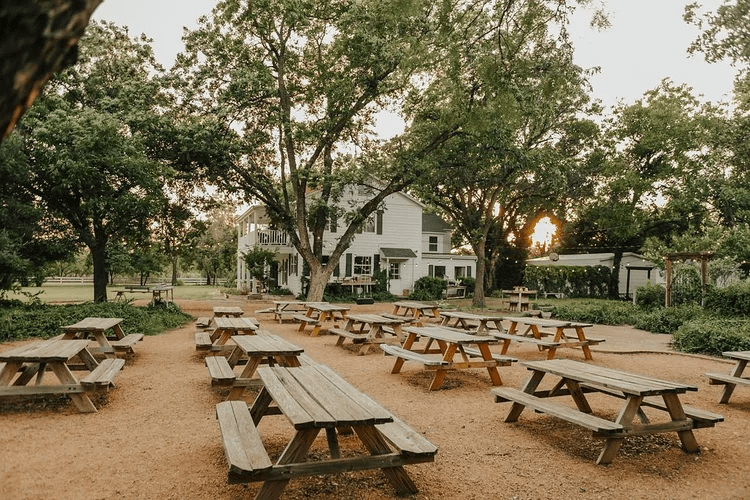 My sister chose a beautiful venue for her wedding. It was an old farmhouse with charm and 3 acres outdoors for the event. The venue came with chairs, pews, and wooden picnic tables for the ceremony and reception.